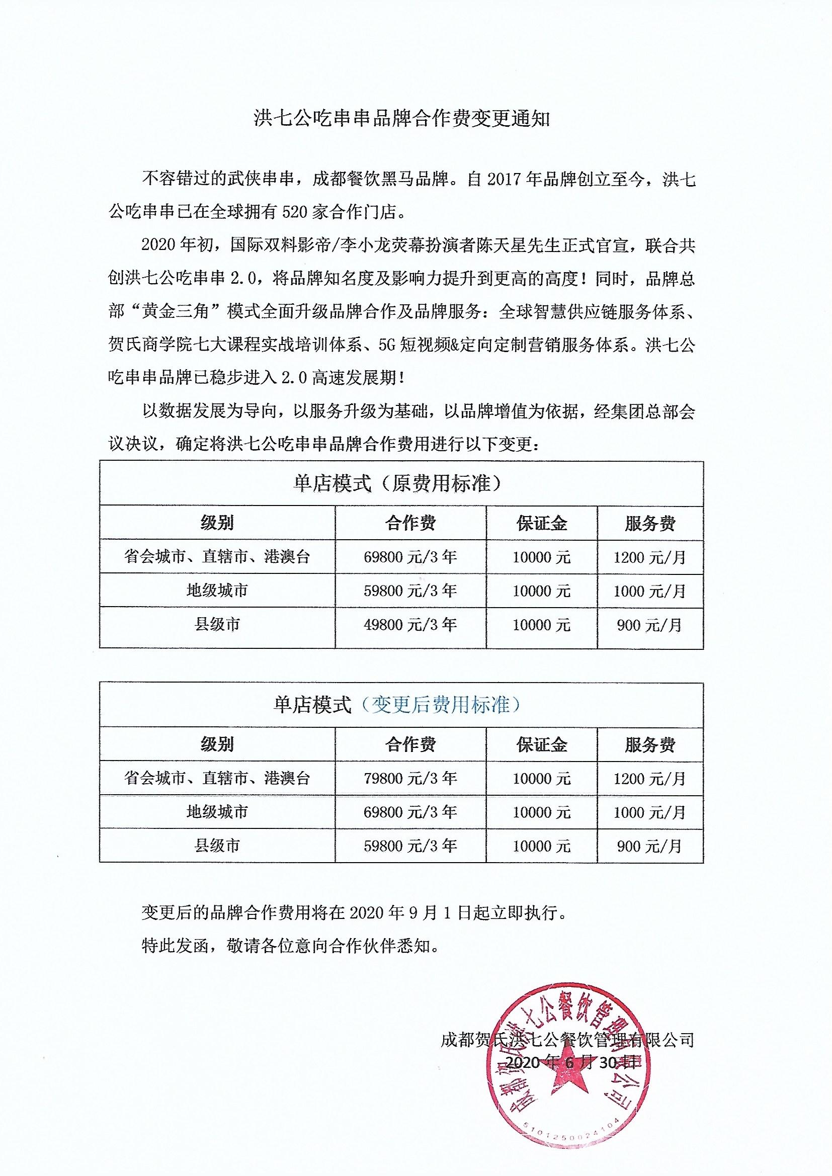 鉴于行业发展趋势及品牌全方位升级赋能,经集团总部研究决定:洪七公吃串串品牌各阶梯合作费将全部上涨10000元整。考虑到已咨询、预约考察或已缴纳定金预定名额的加盟商伙伴的权益,该项决定自2020年9月1日开始全面执行。